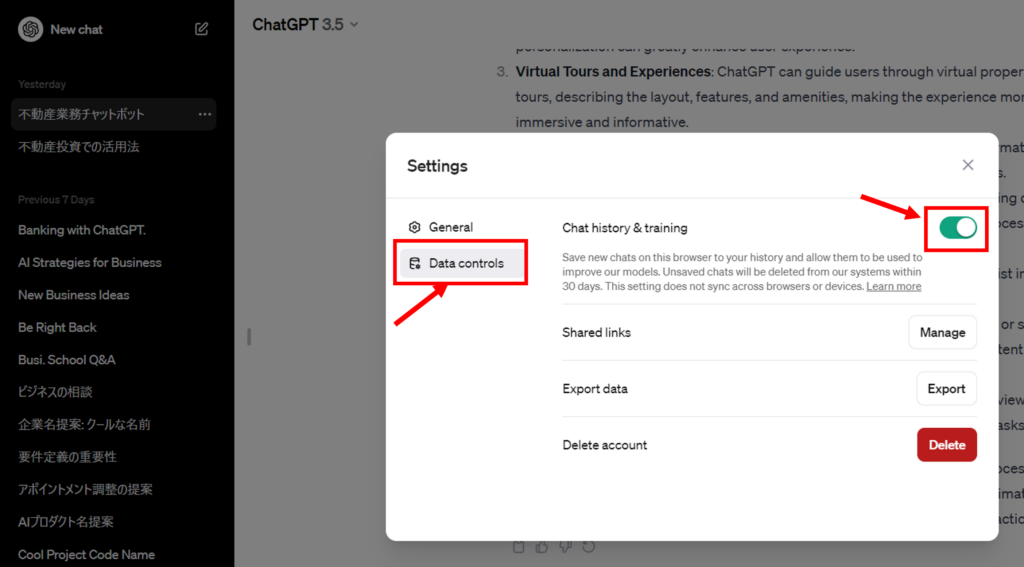 - Step3 「Data Controls」を選んで「Chat history & training」のボタンをクリック