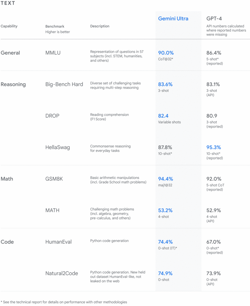 下表は、「Gemini Ultra」とOpenAIのGPT-4とのパフォーマンス比較です。